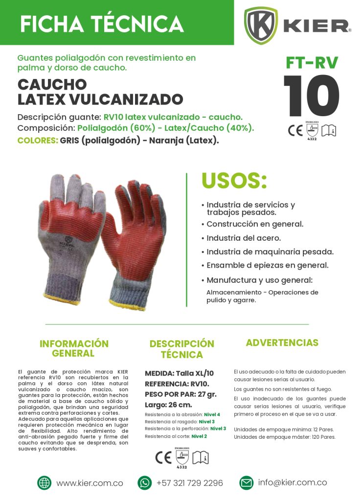 Descripción guante: RV10 latex vulcanizado - caucho.